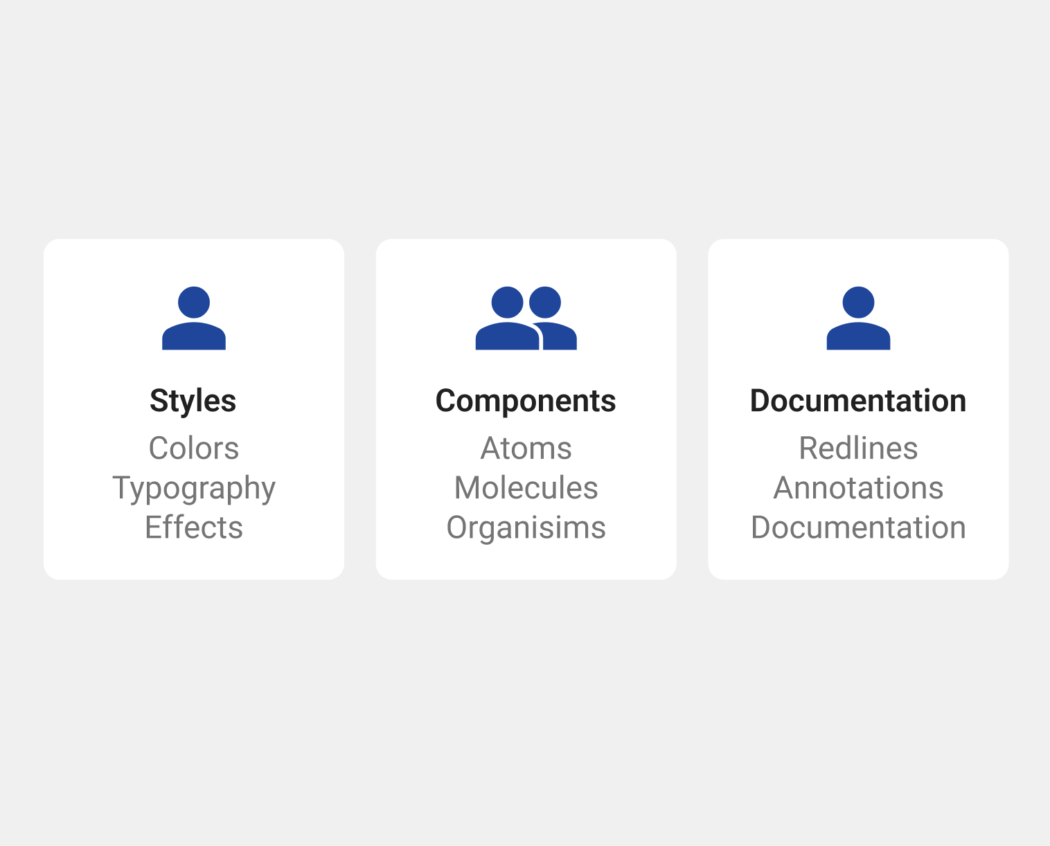 We constructed our design system by following the atom, molecules, and organisms structure. As part of the scoping we determined the organism level was the highest we wanted to go for this 1 sprint project. Templates/ Page Layouts would follow after the initial effort.