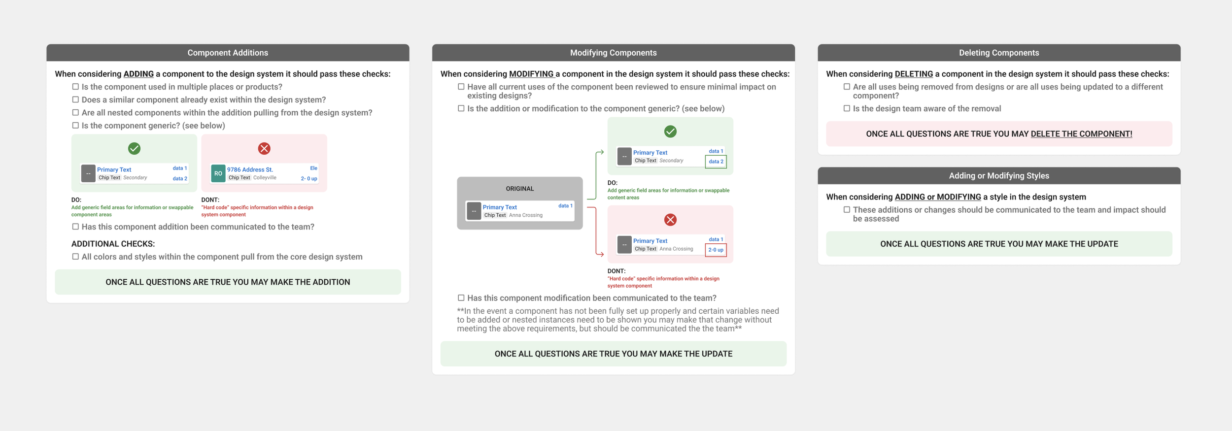 Having established the design system I formalized the process for making design system contributions. As I was the team’s informal design system manager, I installed the process including a checklist enabling all of the design team members to contribute to the design system so long as it followed the defined rules and funneled through the proper channel.